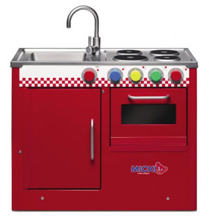 Det klassiska miniköket – spis och diskbänk i ett – har fått en uppfräschning. Nu med silverfärgad häll och diskbänk med snygg pump. Spisdelen har klickbara vred både till plattorna och ugnen.