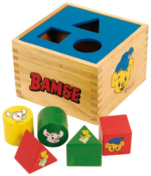 Innehåller: Plocklåda med 5 st olikformade träklossar i glada färger.