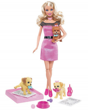 Barbie har haft en rolig dag med sin nya valpar! Efter att hon matat vatten till alla sina 3 valpar, går de potta för att avslöja en överraskning på tidningen. Tidningen ändrar färg, gult eller brunt! Var och en av valparna gör sina behov på olika sätt. Hanhunden lyfter på benet när du trycker ner svansen, tiken hukar sig när du trycker ner henne på ryggen. Tredje valpen behöver bara en klämma på magen för att göra sina behov och avslöja en överraskning. Och när Barbie matar valparna igen är det dags att rastas igen!