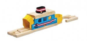 Hoppa om bord – nu kan tågen åka båt! Med den här tågfärjan är stora sjöar eller stormiga hav inget hinder för resan. Med de två inkluderade dockningsskenorna kör tåget rakt upp på färjan som kan lastas från både för och akter. När man trycker på skorstenen hörs ljudet av en mistlur, lamporna lyser och båtresan kan börja!