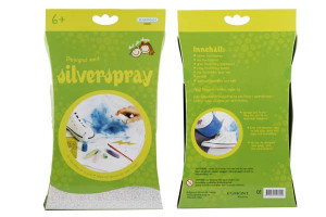 Innehåller: silver, blå, grön, rosa och lila textilspray, pensel och instruktionshäfte med mall.