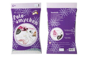 Innehåll: 2 fyrkantiga metallhängen, 2 runda metallhängen, 2 rektangulära metallhängen, Rosa band (1 m) i mockaimitation, svart strechtråd (1 m), 2 satinpåsar (rosa och svart), mobilsmycke, dubbelhäftande tejp, bubbelstickers av plast, instruktionshäfte.