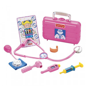 Precis vad läkaren ordinerade! Fungerande stetoskop, blodtrycksmanschett med snurrande mätare, termometer som mäter hur sjuk du är, låtsasotoskop, spruta med fjäderbelastning, bandagearmband. Alla delar kan förvaras i doktorsväskan.