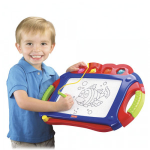 Nu har Doodle Pro ett nytt utseende med samma funktionella utrustning som förut. Den har en stor ritskärm, en enkel spak för att radera och 4 stycken tryckstämplar. Två greppvänliga handtag och en centralt placerad penna med snöre.