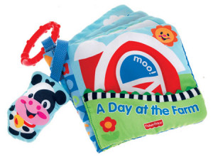 Varje sida i boken visar ett färgglatt djur från bondgården. En liten mjukisko är fäst på boken som ett bokmärke. Boken är i 100% polyester och kan maskintvättas.