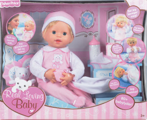 Real loving baby är nästan levande på riktigt! Hon rör sig och interagerar med dig precis som en riktig baby. Först får du döpa henne och hon kommer faktiskt ihåg sitt eget namn. Hon kan leka tittut, berätta för dig när hon vill ha sin mat, leka med sin nalle, kramas med dig och mycket mer. Hon innehåller över 80 st olika ljud och fraser.