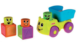 Babyn kan enkelt stapla klossar och sedan trycka ned föraren så flaket hoppar upp.