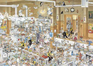 Ett skojigt pussel att lägga för hela familjen! Många härliga figurer och bilder smyger fram när du lägger bitarna på plats. Du kan också leta efter den lilla hajfenan som finns med i varje pussel från Jan van Haasteren. Tävla om vem som finner fenan först?