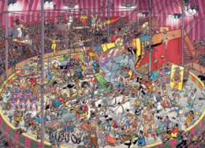 Ett skoj pussel att lägga för hela familjen! Många härliga figurer och bilder smyger fram när du lägger bitarna på plats. Du kan också leta efter den lilla hajfenan som finns med i varje pussel från Jan van Haasteren. Tävla om vem som finner fenan först?