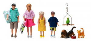 Här är Gotlandfamiljen och deras husdjur; den söta katten, den snälla hunden som gillar att vila i sin hundkoja och den roliga papegojan som sitter på sin pinne utanför huset. Alla dockor i Lundbyfamiljen är ledade för att de ska kunna röra på armar, ben och huvud. Kläderna går att ta av och på.
