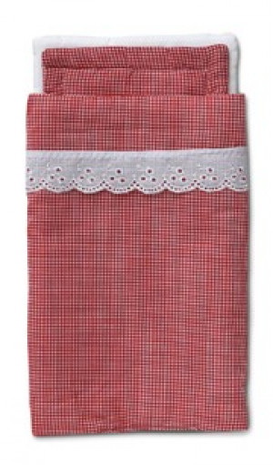 Ett litet rött- och vitrutigt bäddset med vit spets på täcket, speciellt framtaget för att passa den röda sufflettvagnen. Tål maskintvätt 30 grader.