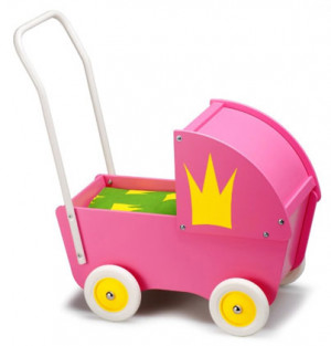 En klassisk trädockvagn med fast sufflett. Passar till lite mindre dockor eller favoritmjukisarna.