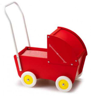 En klassisk trädockvagn med fast sufflett. Passar till lite mindre dockor och kramdjur. Röd-vitrutigt bäddset som passar till dockvagnen finns att köpa till (Nr 10.2041).