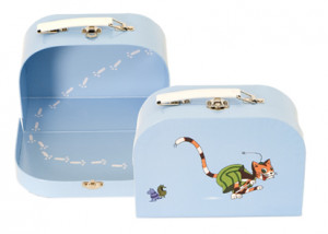 Söt liten ljusblå väska från serien Pettson och Findus. Motivet på framsidan är Findus när han hoppar och på baksidan när han dansar. Innuti kan du se fotspår av Findus.
