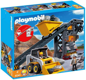 Transportband med minigrävmaskin, två figurer och stenblock Tippvagnen kan köras med vinschlina, transportbandet och skopan på minigrävmaskinen är rörliga.
