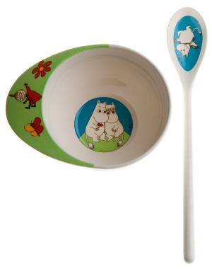 Tålig barnservis i repsäker melaminplast med motiv av Mumin.