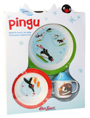 Tålig barnservis i repsäker melaminplast med motiv av Pingu.