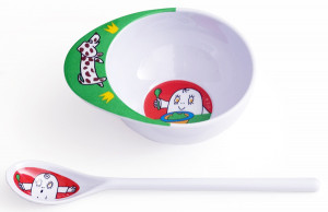Tålig barnservis i repsäker melaminplast med motiv av Spöket Laban.