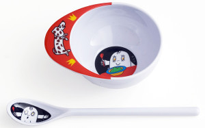 Tålig barnservis i repsäker melaminplast med motiv av Spöket Laban.